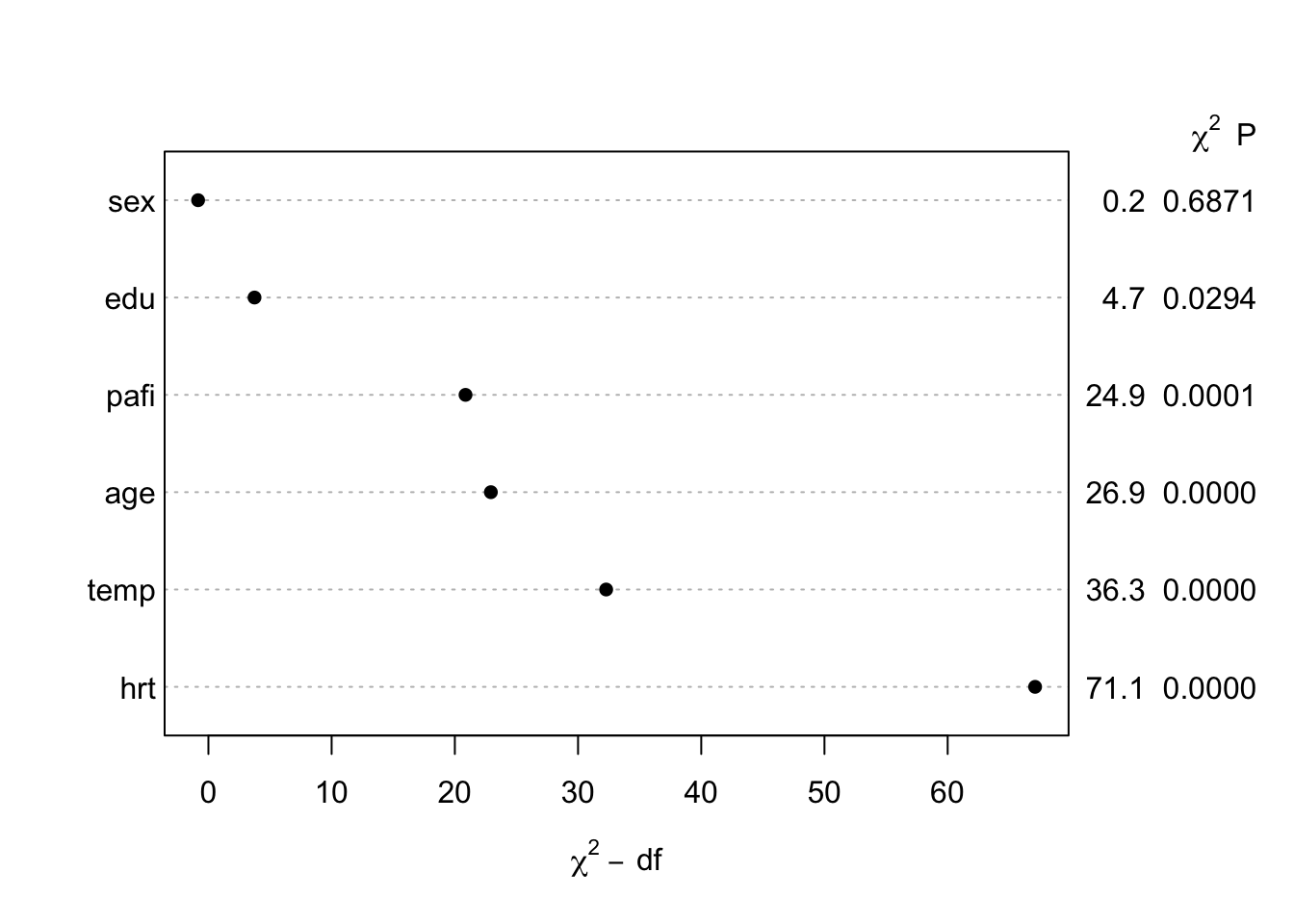 - Compute the partial \(\chi^2\) statistic for testing the association of each predictor with the response, adjusted for all other predictors.