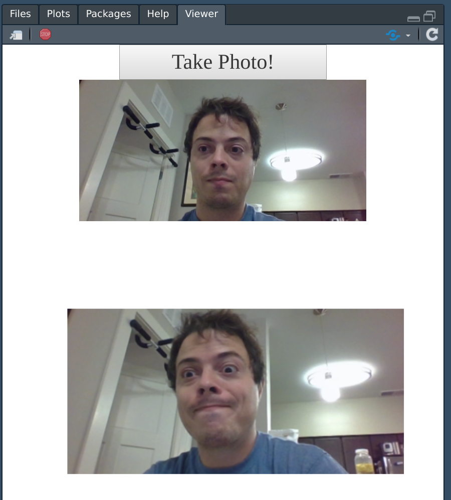 This, along with my recent dive into deep learning, spurred a renewed effort to add vision to shiny’s senses. The result is the new function shinyviewr, which, like the rest of shinysense, comes in the form of a shiny module that can be easily added to your app to endow it with the ability to sense the outside world.