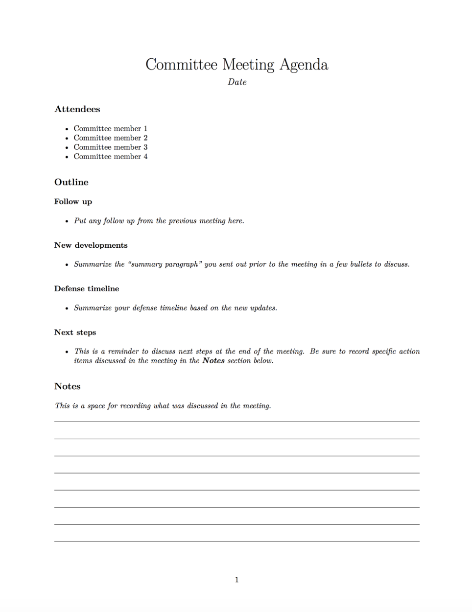 I had committee meetings every three months. This was double the number required, but I found it really helpful for keeping my timeline. In order to get away with hosting so many meetings with many Very Busy people, these meetings had to be informative and efficient. I did a few things to try to achieve this, here are my recommendations: