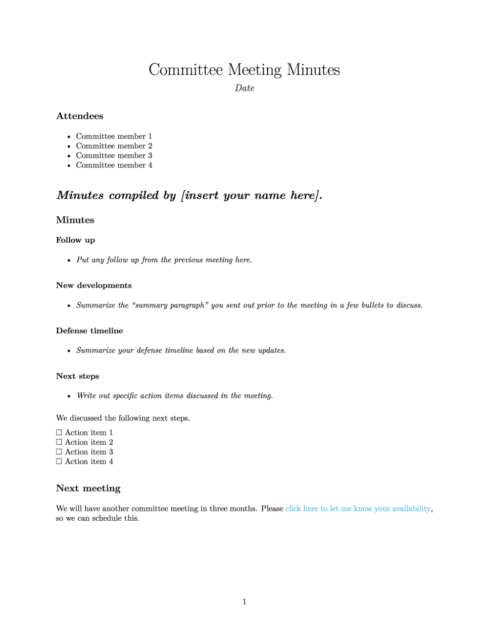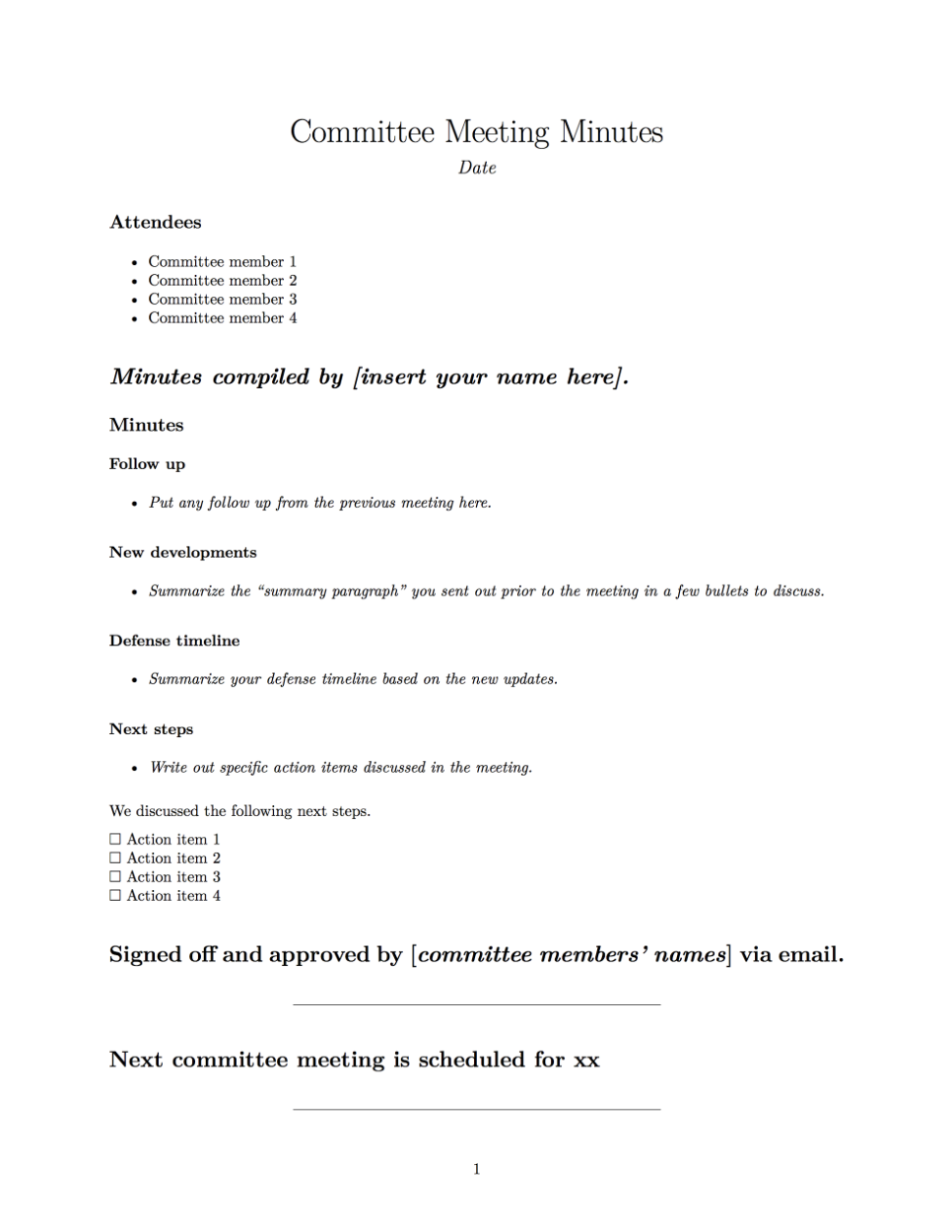 - Compile a final document with the meeting minutes, the date for the next committee meeting, and a line indicating that all committee members signed off on the current plan. Here is what mine often looked like.