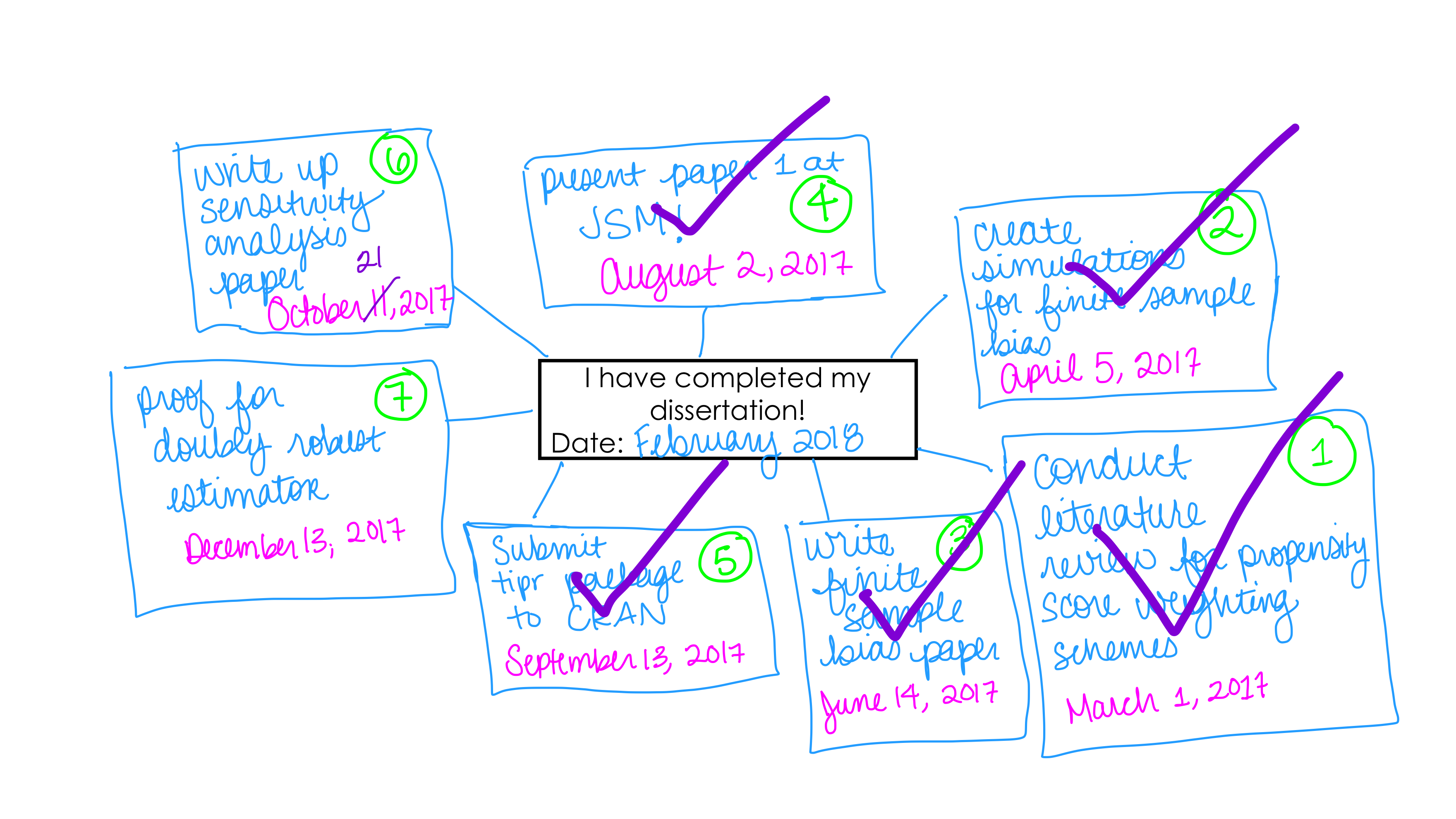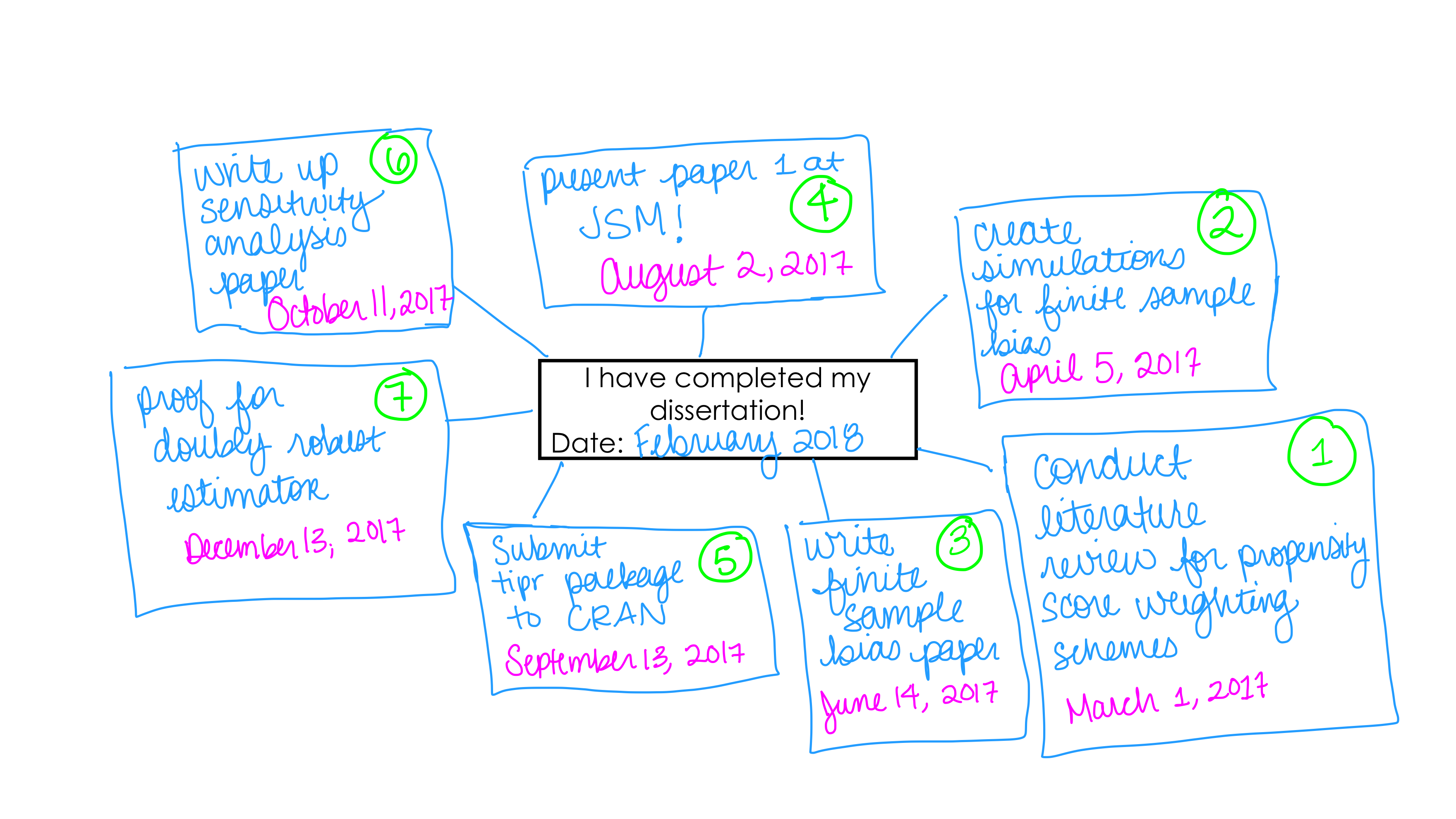This section is going to explain the specifics behind how I planned my dissertation timeline. I found it really helpful to have specific goals on detailed timelines in order to create structure around an inherently unstructured time.