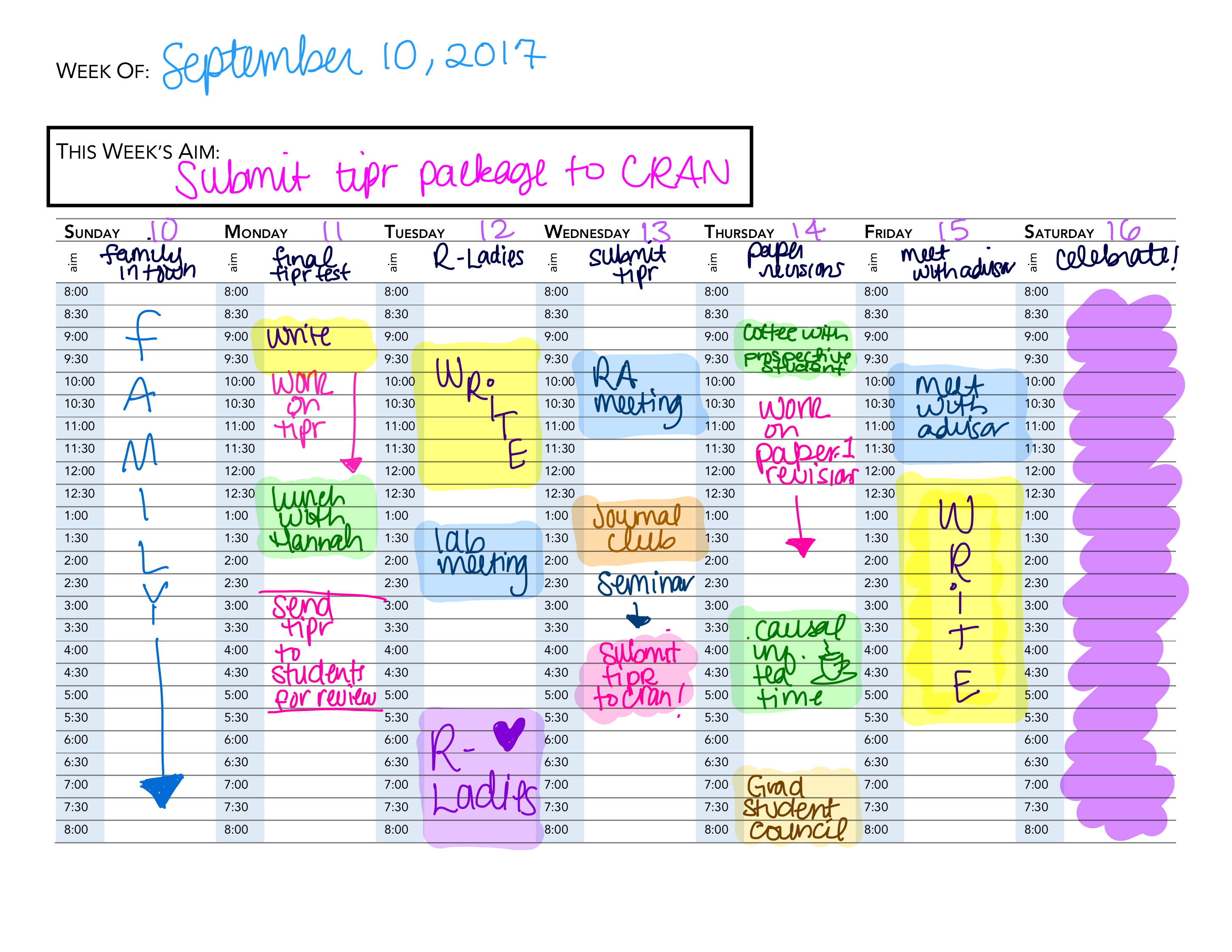 Speaking with current and former PhD students, many of us find / found one of the most difficult parts of the PhD process was the element of unstructured time. I thought it may be useful to lay out one way to structure this time. For that reason, I am specifically focusing on the dissertating phase of a PhD rather than the coursework portion.
