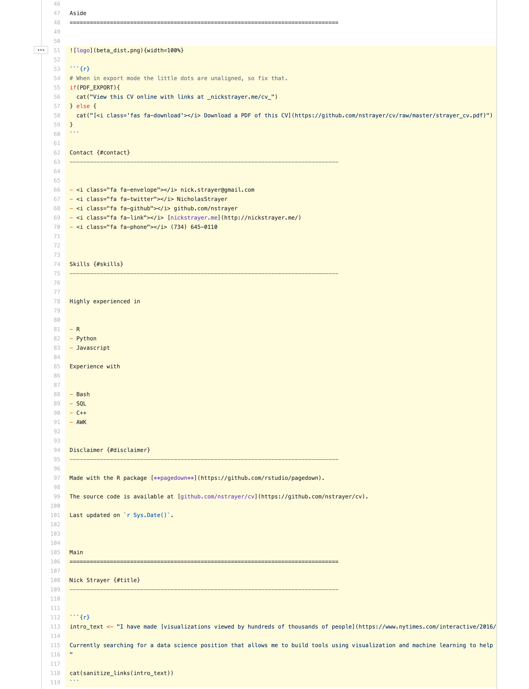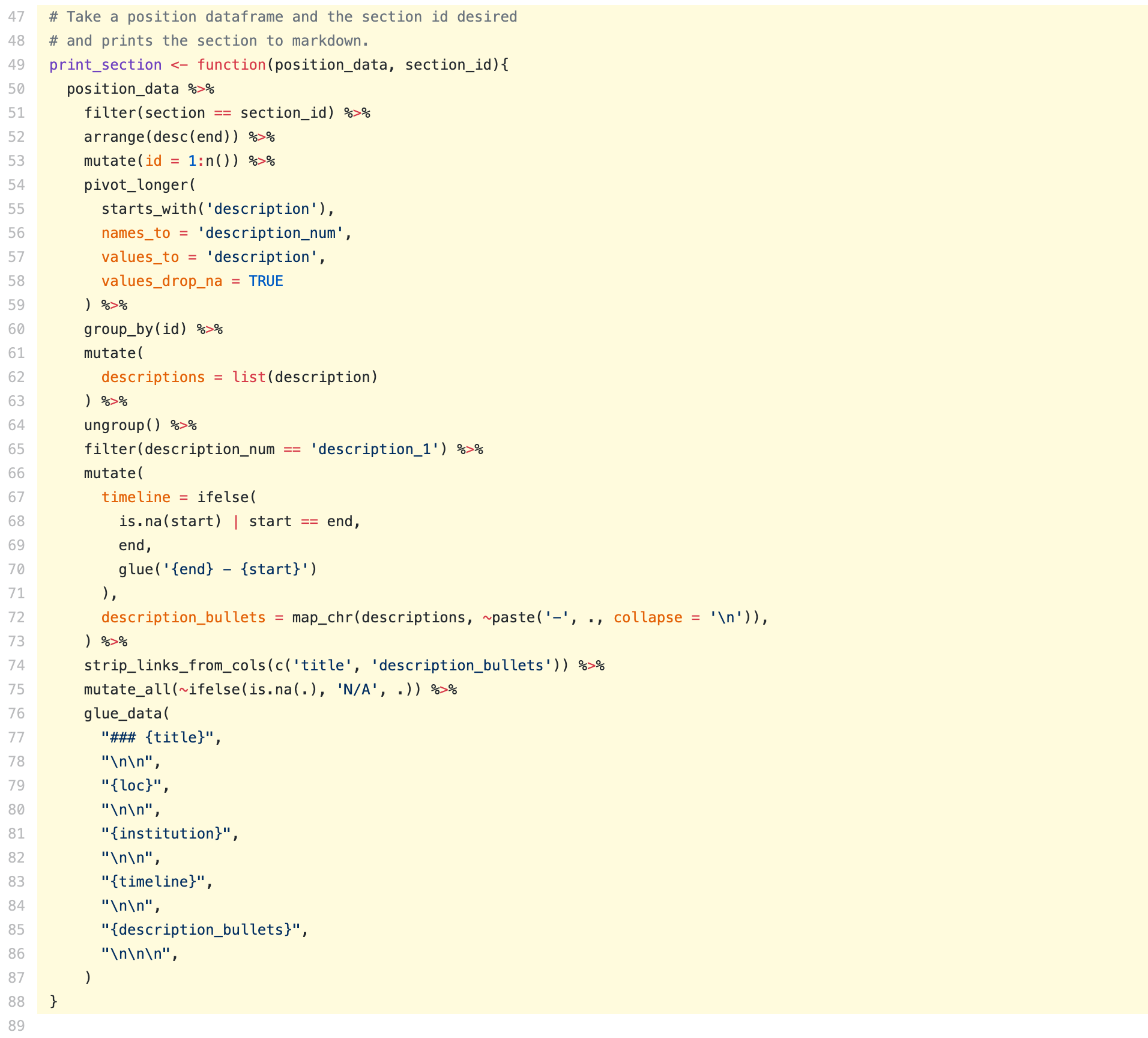 This means we can write the markdown for a resume position by encoding all the necessary details about the position in variables and passing those variables to glue()