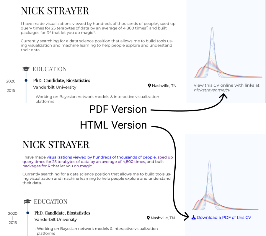 I took advantage of this PDF export value to add a conditional text entry at the top of the document. This tells readers of the PDF version that there is an HTML version and gives readers of the HTML version a link to download the PDF version.