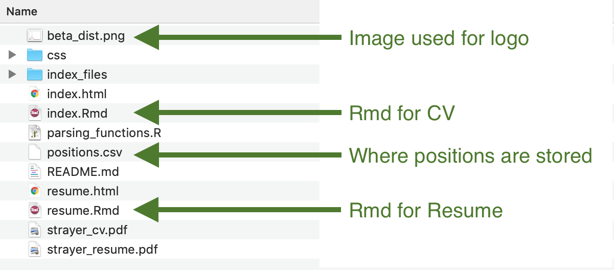 The main file you need to change is positions.csv. Once you have all your positions in then go into the main index.Rmd if you’re making a CV or resume.Rmd if you’re making a resume.