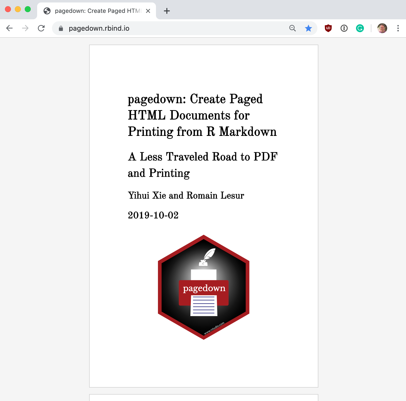 Pagedown is a new R package that formats the final output from your Rmarkdown into paginated HTML. I had the pleasure of sitting in the very back of a packed conference hall at RStudio::conf 2019 when Yihui Xie introduced Pagedown. You can watch the presentation from a much better vantage point than I had on the RStudioConf presentations site. This HTML can then be easily turned into a PDF by using the print function in your browser. Previously, if you wanted to generate a PDF from RMarkdown, you had two options. You could just print unpaginated HTML (ugly), or you could compile to Latex, which meant you losing out on a lot of niceties that are provided by CSS formatting. Personally, I know a lot more about formatting with CSS than I do with Latex, so this was a perfect fit for me.