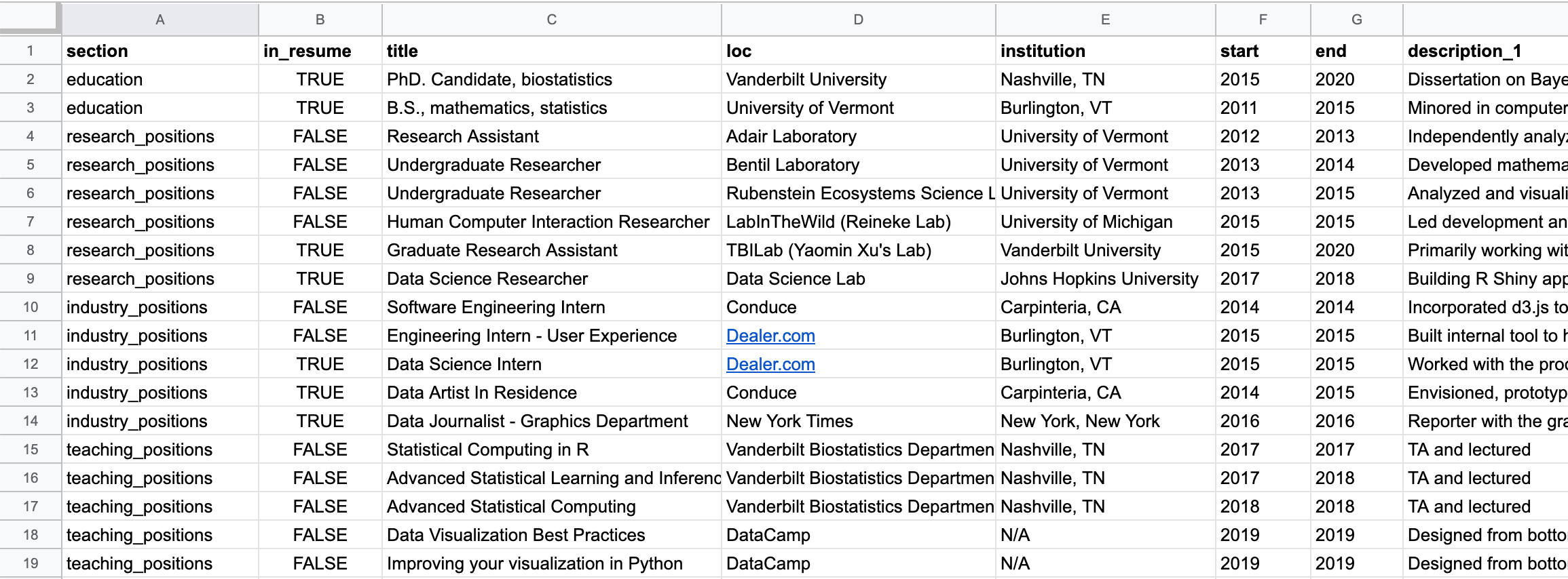 A programmer would look at a problem like this and say, “any scenario where I repeat the same actions I should write a script.” Since I self-identify as a “data scientist” - an unholy mashup of programmer and statistician - I figured I could write a script to do the formatting and store all my information in… spreadsheets! In a hurry and just want to know how you can build your CV or resume this way? Skip to here
