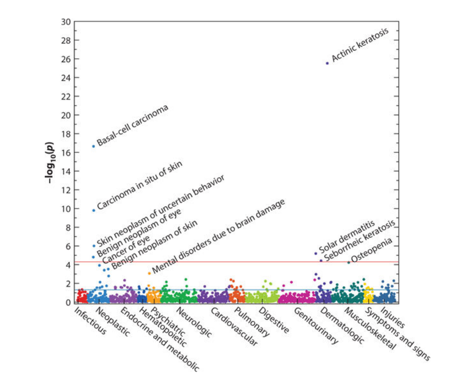 Manhattan plot for PheWAS results. Taken from Denny et al, 2016