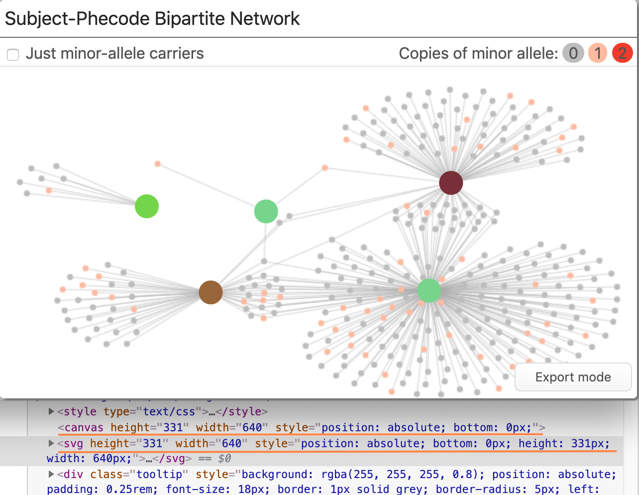 Exporting paper-ready plots One feature that was frequently requested was the ability to export the network plot for use in a publication. Since canvas elements are just raster-images, they didn’t scale well when exported. To allow for clean high-res exports, an ‘export mode’ was added that switches all rendering to the SVG (which is vector-based) and adds a download button. Also available is a callouts mode where little draggable annotations for each phenotype name are added. When a user presses the download button, the SVG element is converted to the SVG file format and downloaded the user’s computer. Adobe Illustrator or other vector-based tools can be used to insert the plot into a figure or PDF.