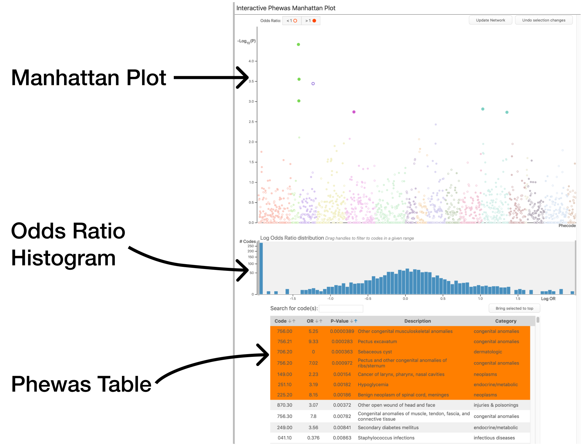In both the manhattan plot and the network plot, when a given phenotype’s point is moused-over, a tooltip with all the supplied information for that phenotype appears.
