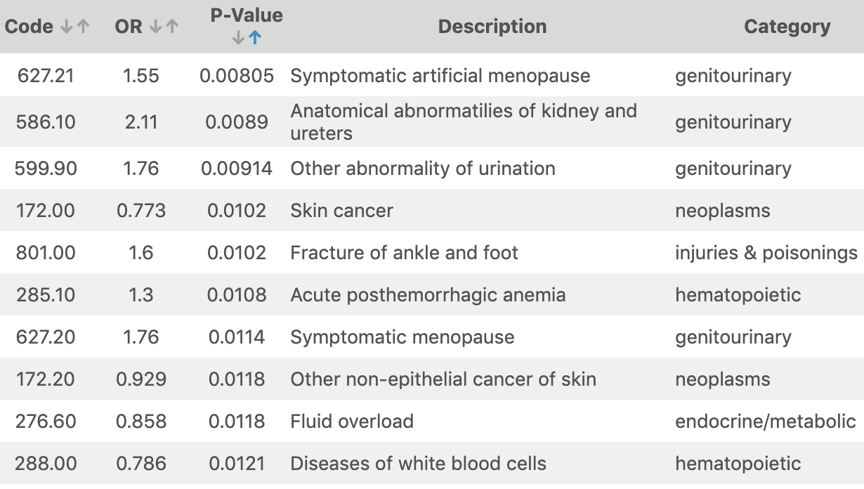 The second is the ever-present table. A PheWAS table has columns on all sorts of values of interest such as p-value, effect-size, phenotype description, etc.. Due to a large number of phenotypes typically present, these tables often get filtered to only includes codes that fit some criteria, such as significance level.