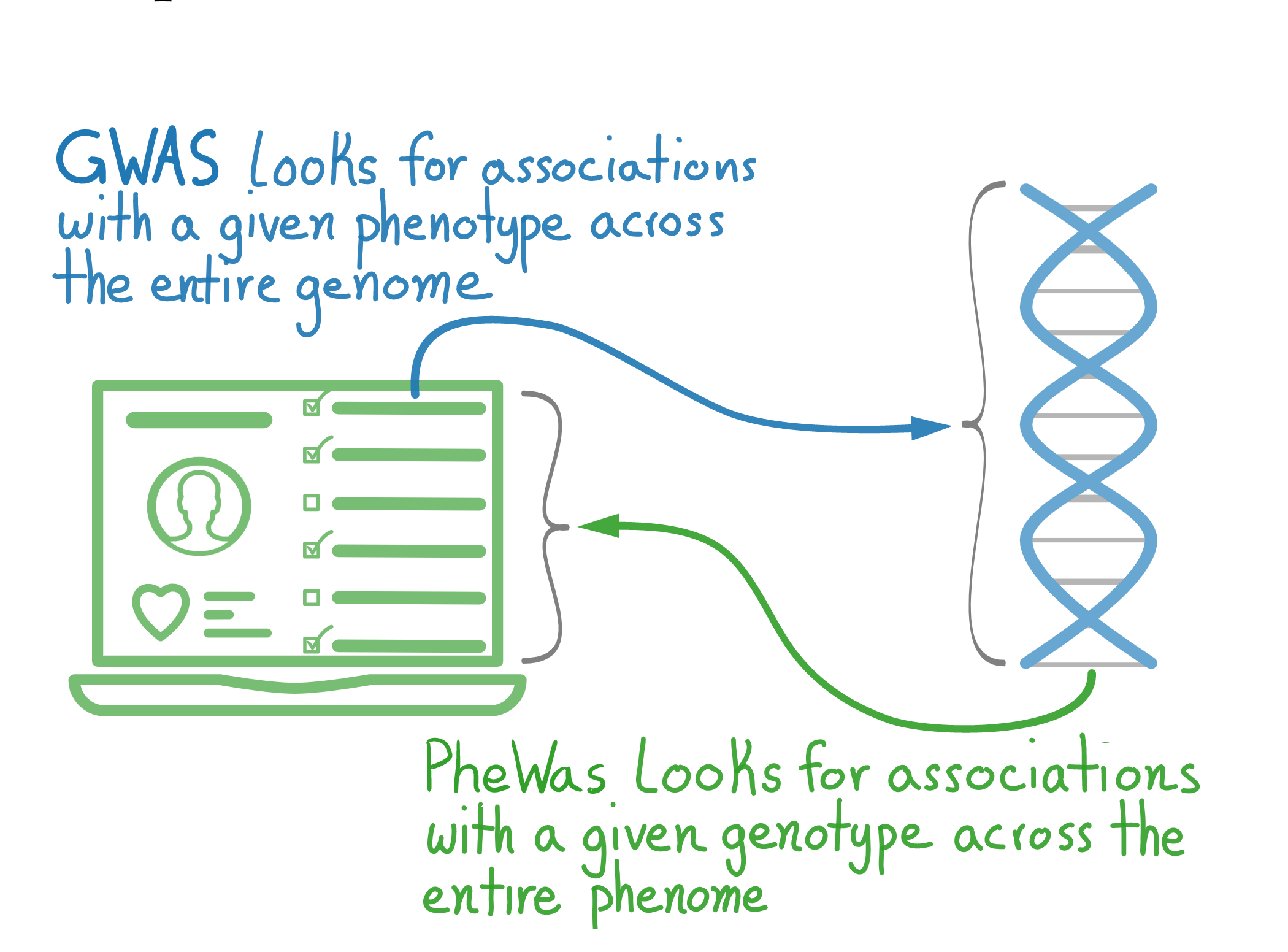 PheWAS is a statistical method for finding associations between a given genetic mutation (often a Single Nucleotide Polymorphism, or SNP) and phenotypes. It is a sibling to the GWAS (genome-wide association study). However, in GWAS, you fix your desired phenotype and scan the genome for associations, whereas in PheWAS, you fix a genetic mutation, and scan the ‘phenome.’