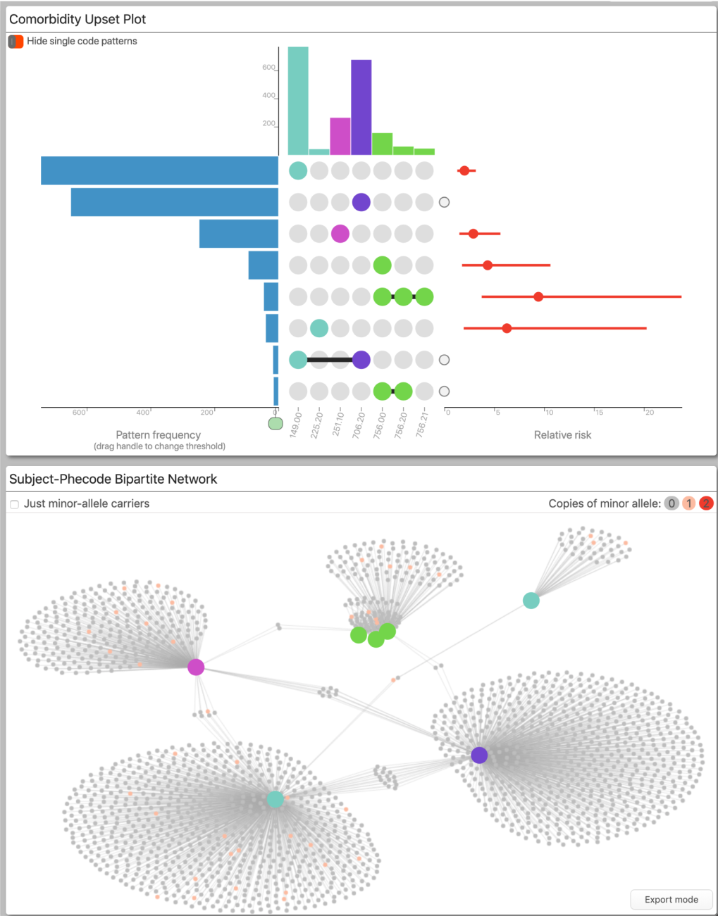 When a user clicks on a given pattern in the Upset Plot panel, the network plot updates to highlight the subjects who have that pattern. Similarly, if a phenotype node in the network plot itself is moused over, the subjects connected to that phenotype are highlighted.