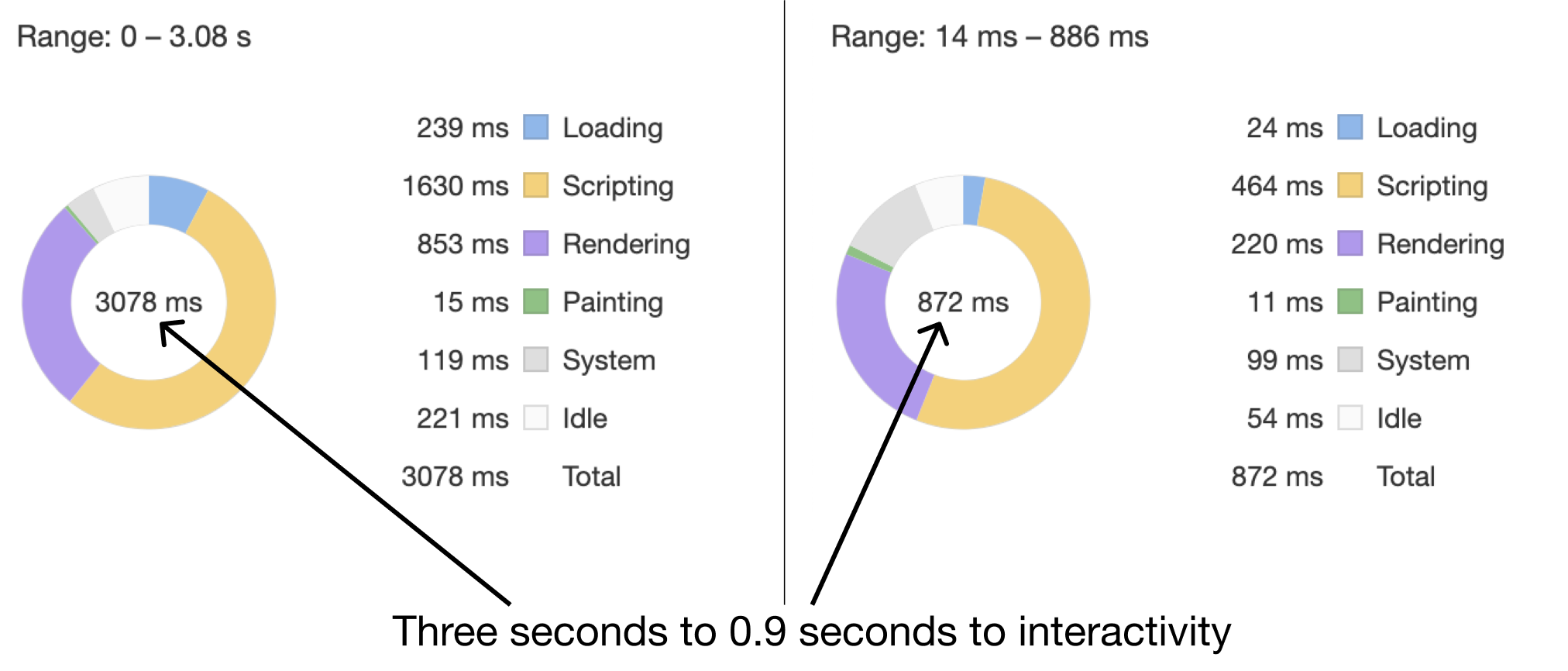 The trick used to display a large table while not overloading the DOM is only rendering a small portion of the table at a time. At any moment, only 50 rows of the table are actually in the DOM. As the user scrolls down, the javascript writes new rows at the bottom and removes old rows from the top. As to maintain the illusion that the entire table is available for scrolling, secret elements placed above and below the visible rows that expand and contract to simulate a table with every row filled in. The user sees a table just like it was full of 1,000 rows, but the browser only has to render 50. Implementing this optimization resulted in interaction latency dropping by ~4 times.