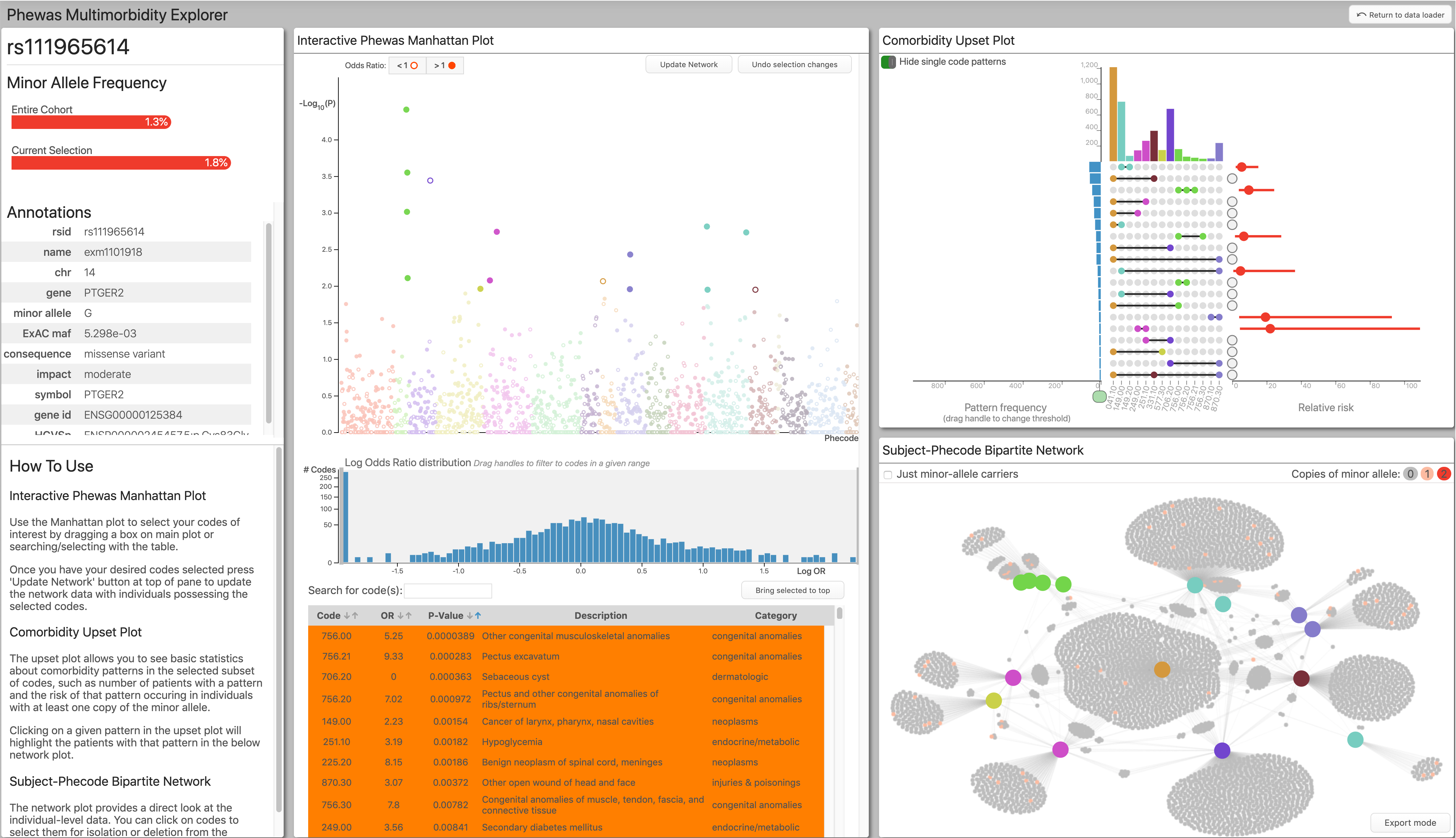 PheWAS-Multimorbidity Explorer helps subject-matter experts parse through the results of a PheWAS analysis by letting them isolate and explore specific regions of phenotypes by looking not only at their p-values and effects-sizes but also by the subject-level data that generated those results.