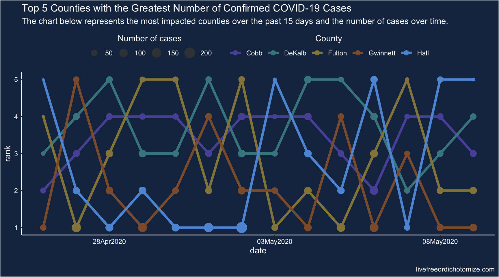 ggplot(aes(x = date, y = rank, color = county)) +