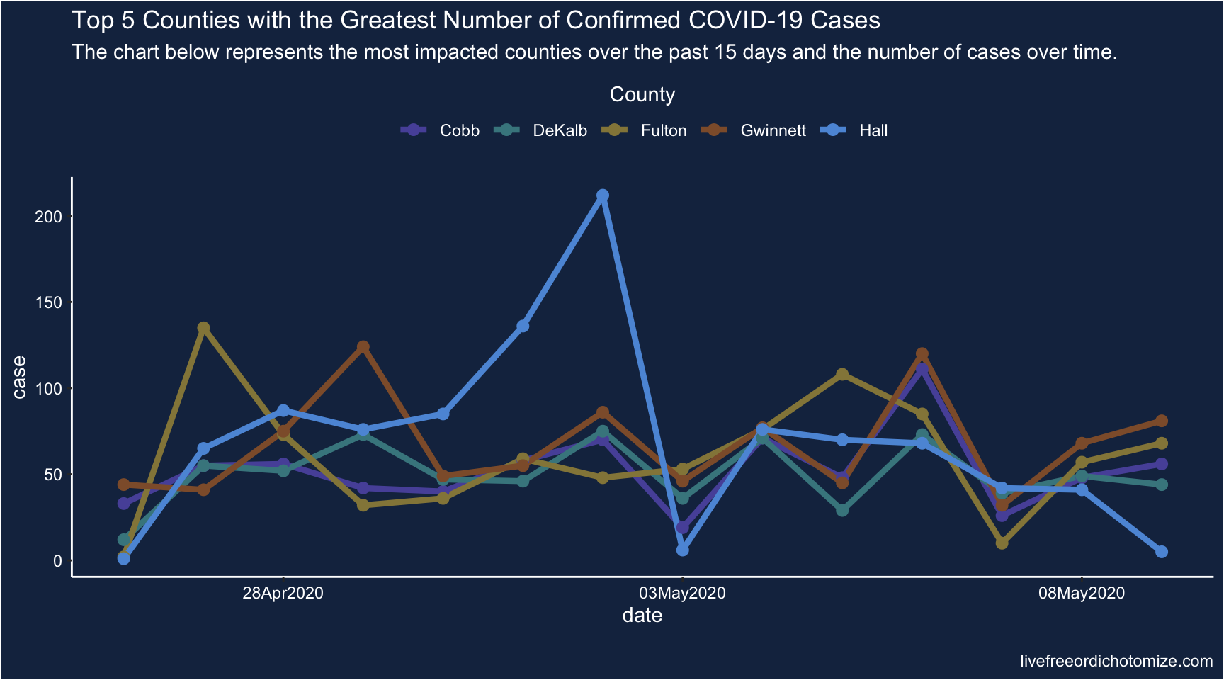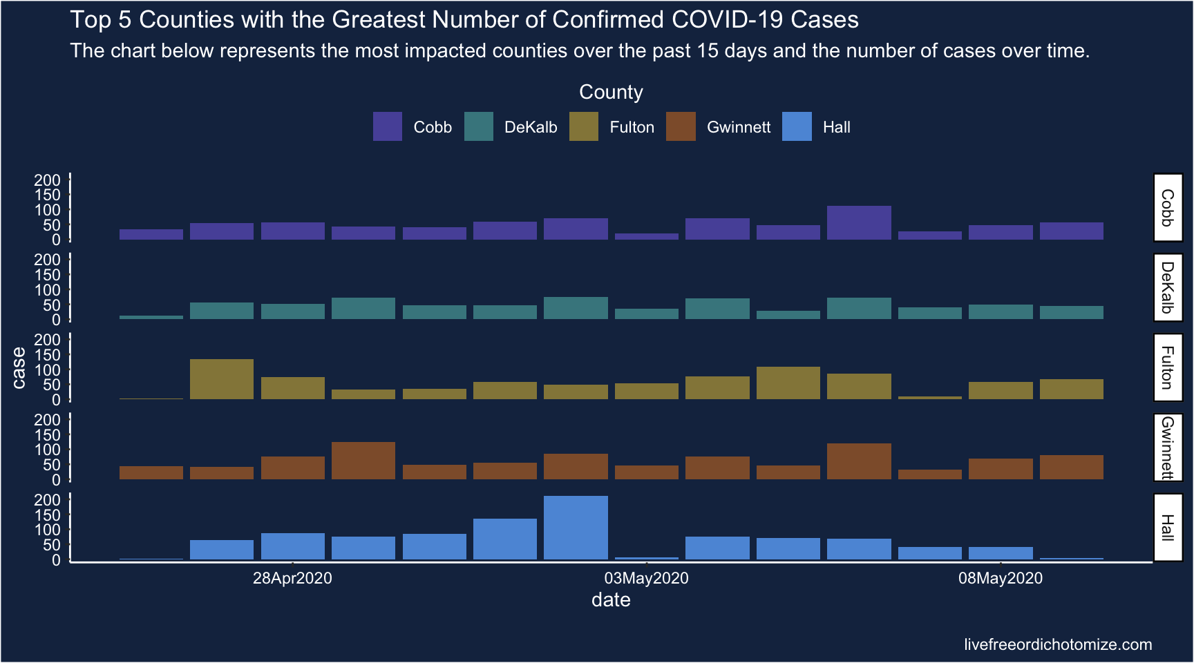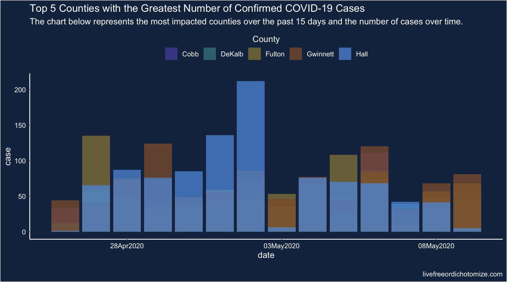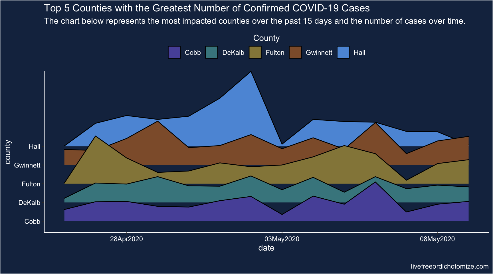 subtitle = "The chart below represents the most impacted counties over the past 15 days and the number of cases over time.") +