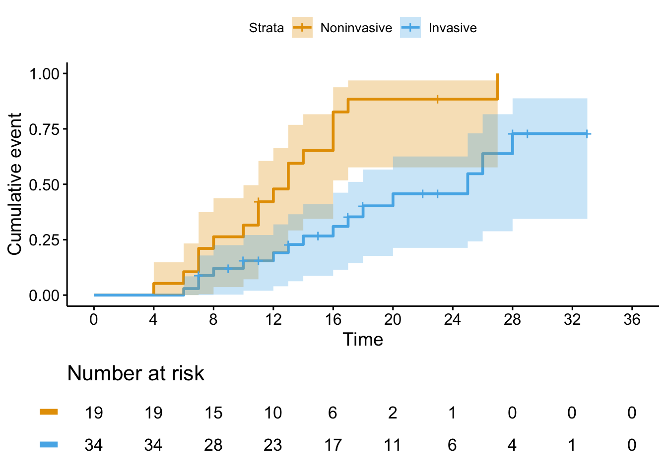 Surv(time, ifelse(event == 1, 1, 0)) ~ invasive,