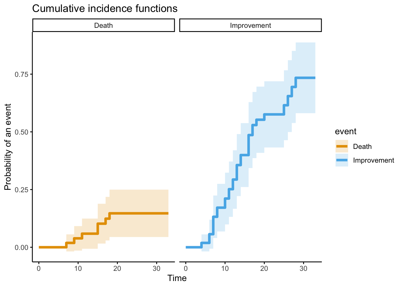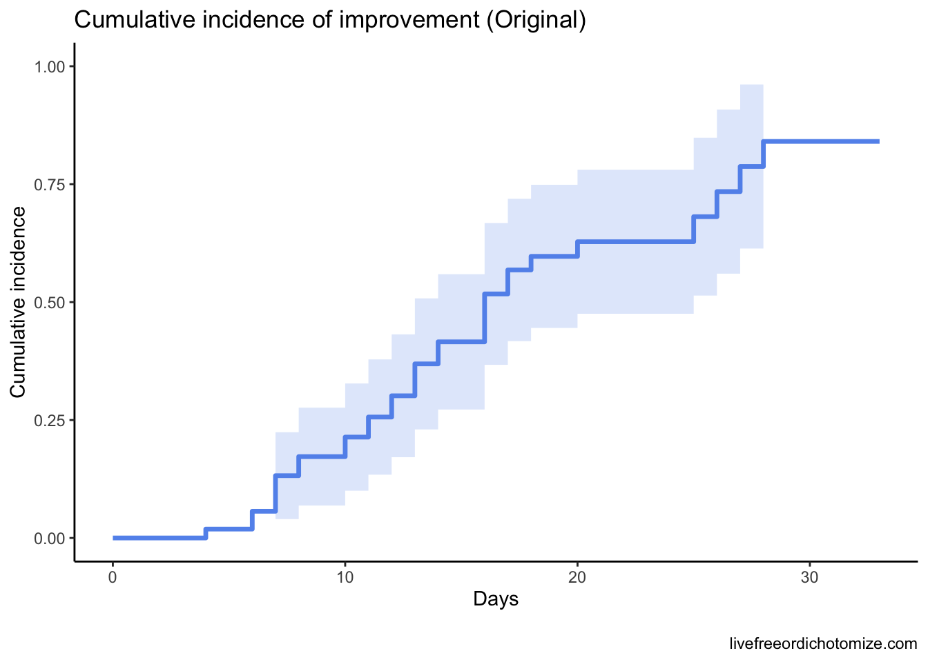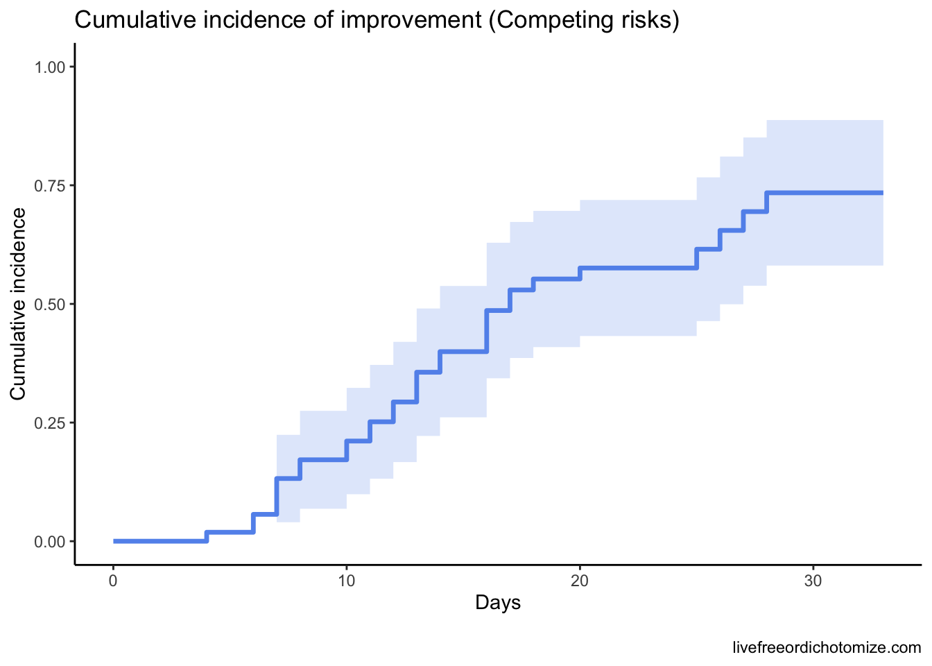 The estimated cumulative incidence of clinical improvement by day 28 is 73%. Here’s two plots that show the difference.