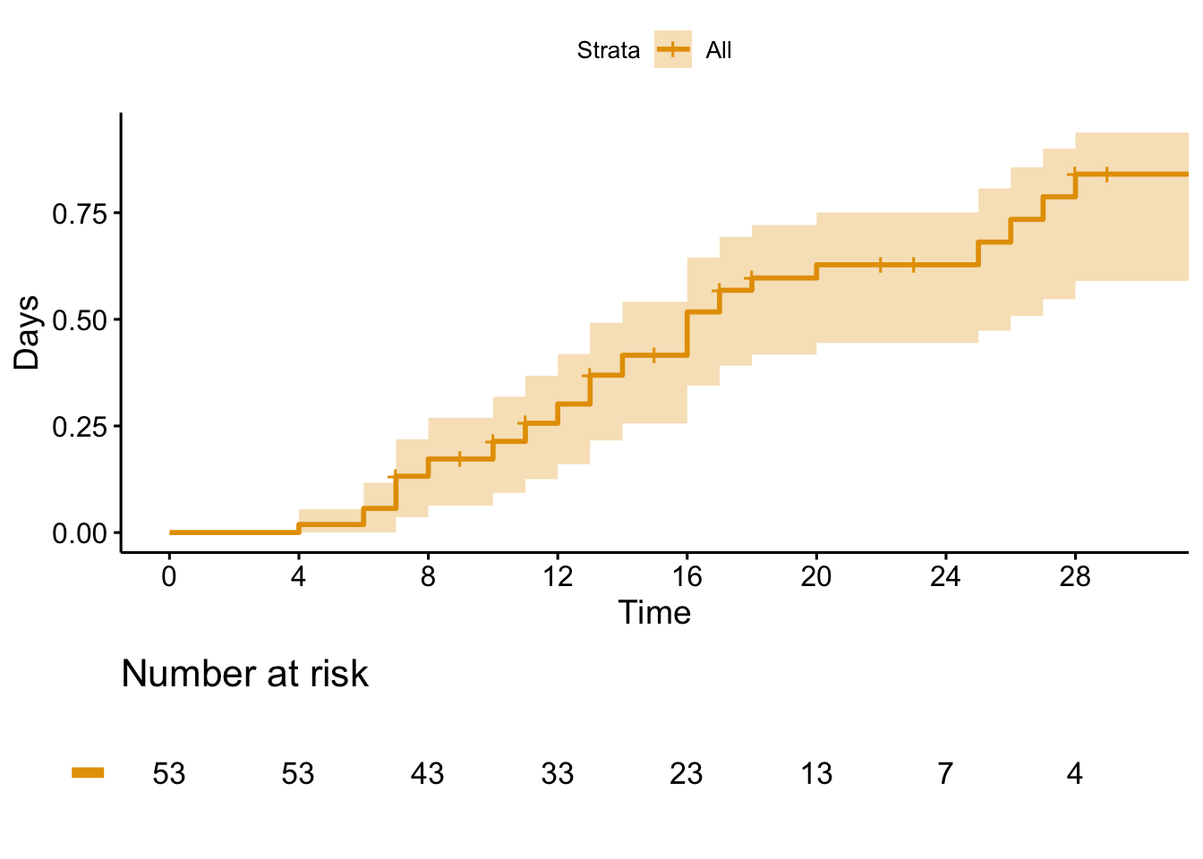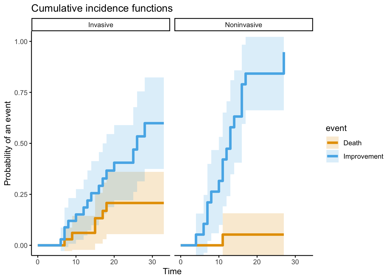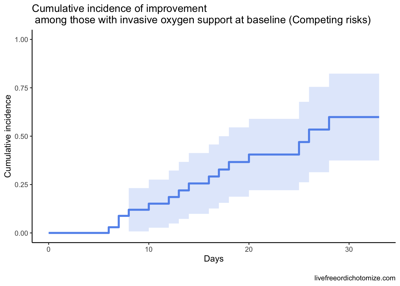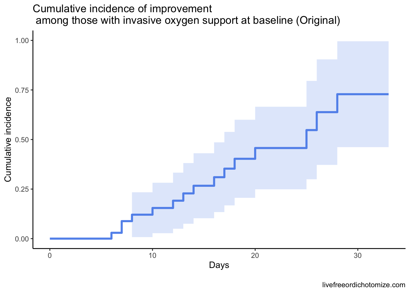 The estimated cumulative incidence of clinical improvement by day 28 is 73%. Here’s two plots that show the difference.