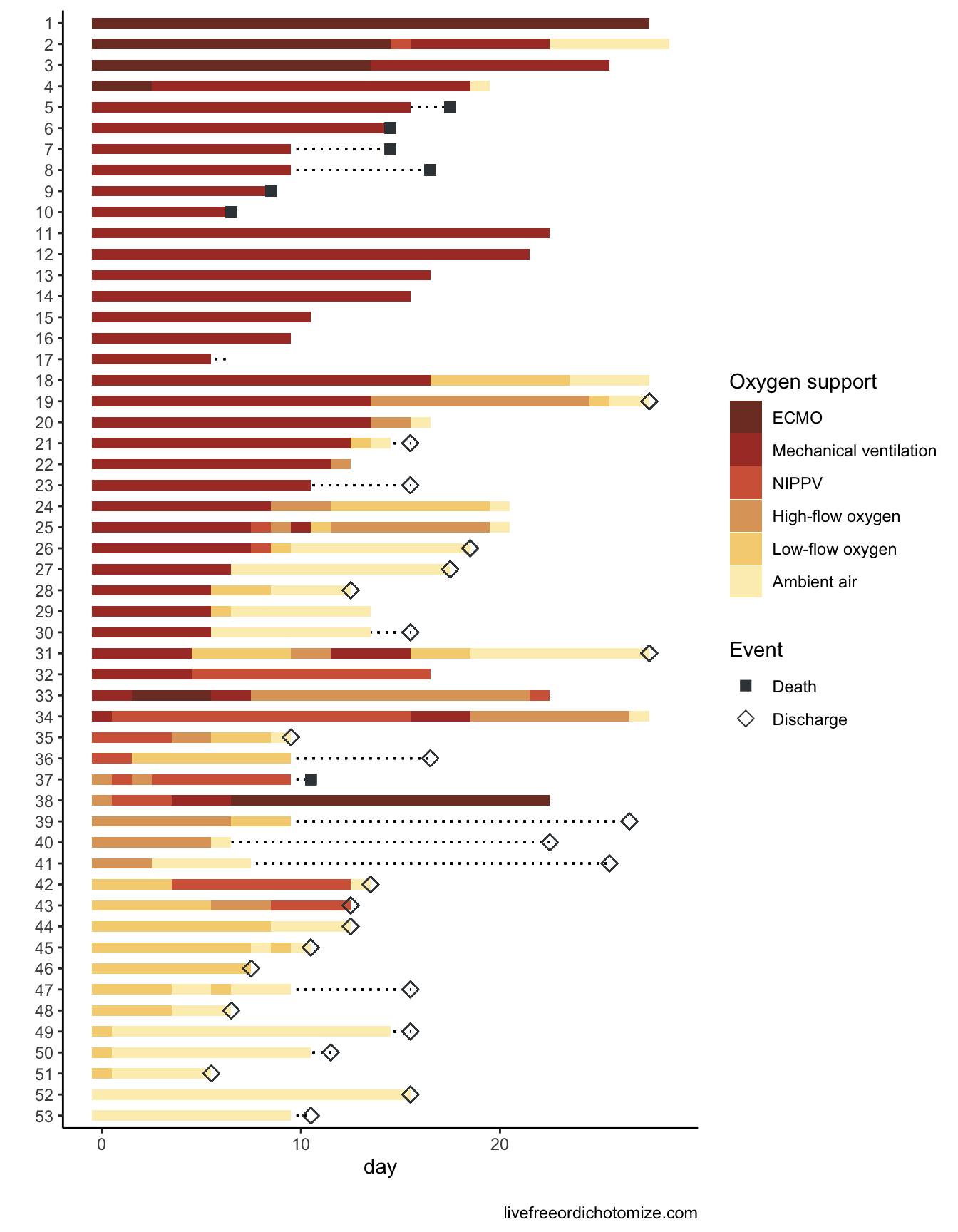 It turns out really this is a story about Figure 3B. Why? Because 6/7 of the patients who died were on invasive oxygen support at baseline, so modeling this correctly has the largest impact on the Invasive line on this plot. Here they were examining the same outcome, stratifying by whether patient had invasive or noninvasive baseline oxygen support.