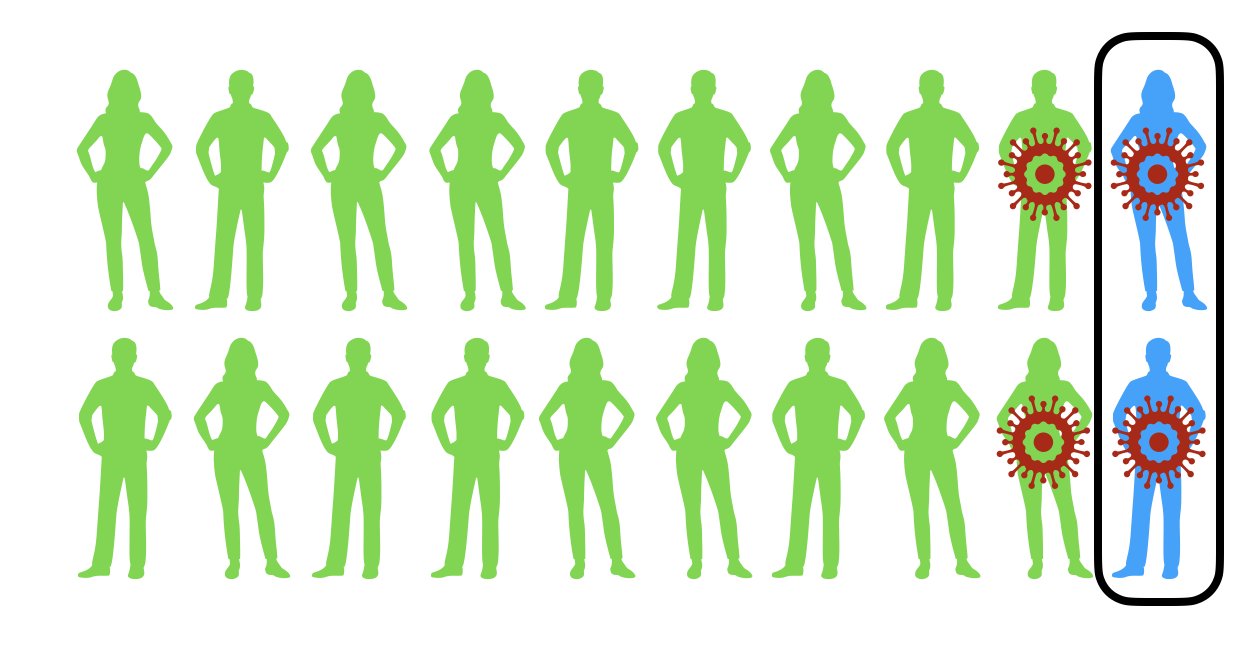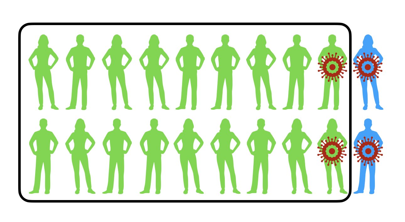 In this scenario, 50% of the sick were vaccinated, but this is the wrong metric to look at! It is using the wrong denominator. It doesn’t take into account that 90% of the population is vaccinated (yay!). r tufte::margin_note('Even Bill Gates made this mistake when he said he\'d [rather encounter a shark than a mosquito](https://twitter.com/BillGates/status/1118196606975787008).')This is called flipping the conditional (and is a problem that we see all the time!). Instead of looking at the probability of being vaccinated given you are sick, you want to look at the probability of being sick given you are vaccinated.