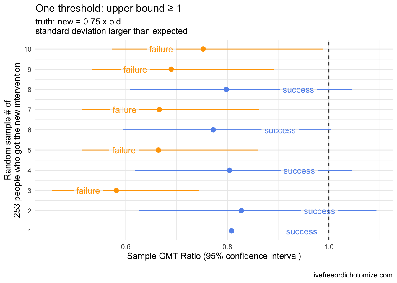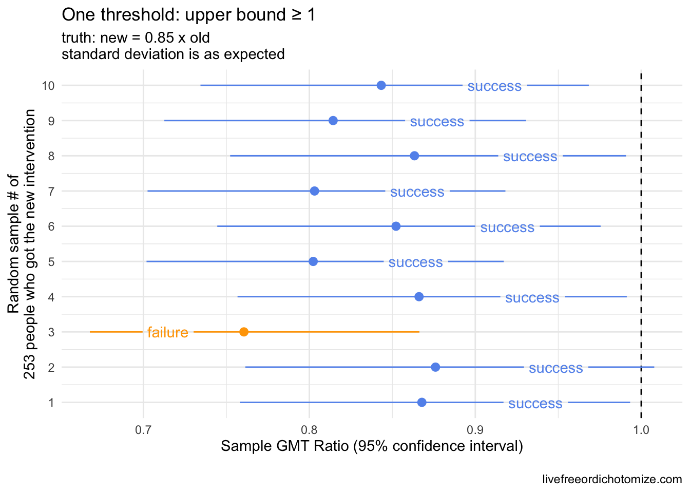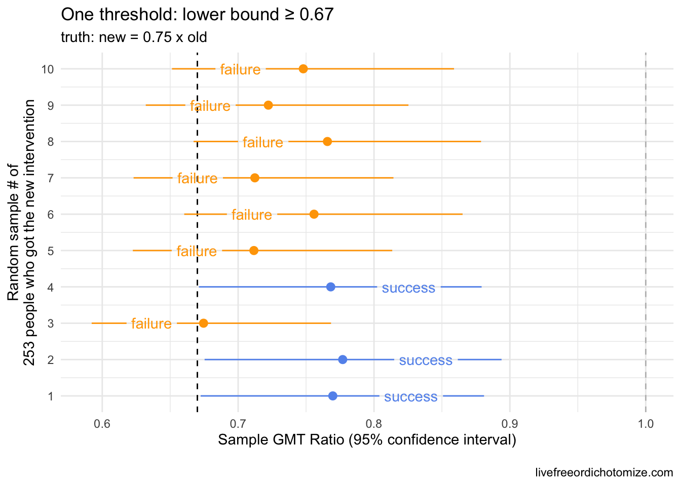 The plot above shows 10 random samples from our new intervention. Remember that these were generated exactly like our old intervention, so the truth is that they are equivalent (and thus it is also true that the new intervention is not inferior, not worse, than the old). Notice here, 50% of the samples “failed” (in orange in the plot above) by our criteria that the geometric mean (the point estimate) of our new intervention had to be greater than or equal to our observed geometric mean in the old intervention. This is exactly what we’d expect to happen! Because there is some random chance involved (we are only looking at a sample), the probability of falling on either side of a point estimate is going to be a coin toss when the “truth” is centered there.