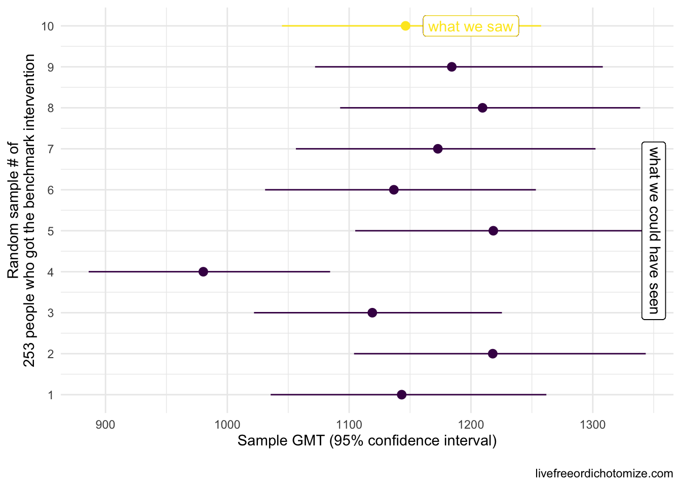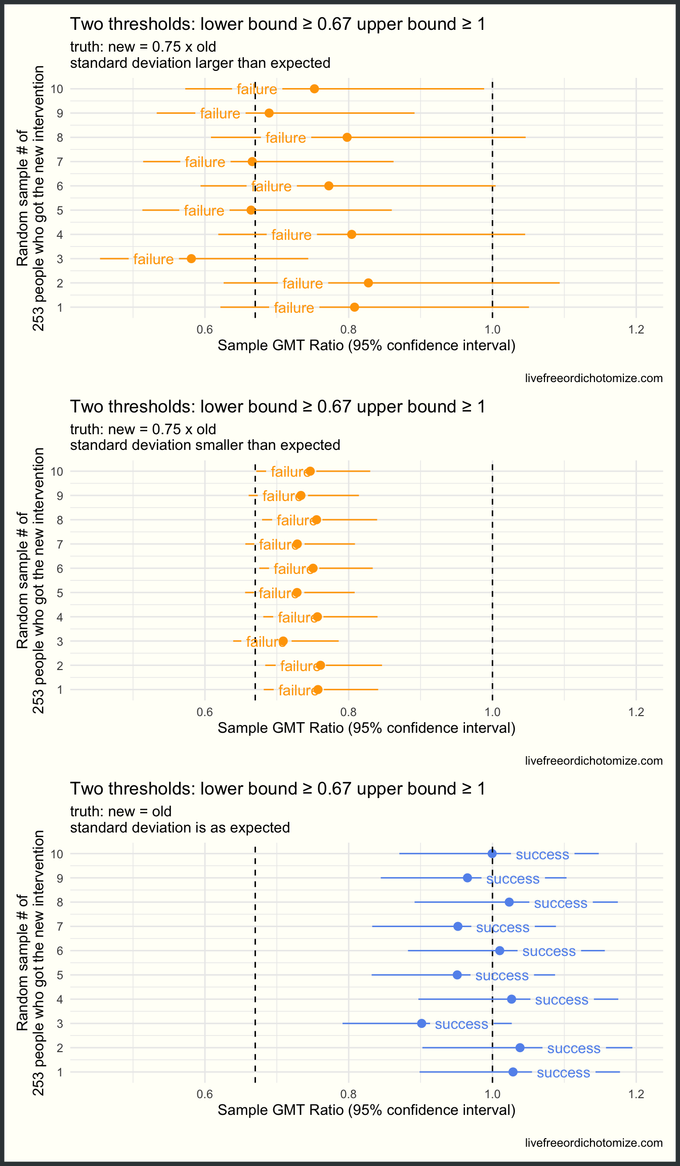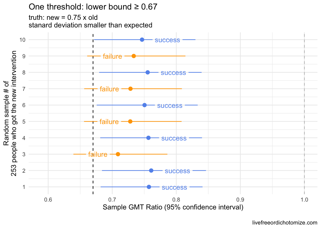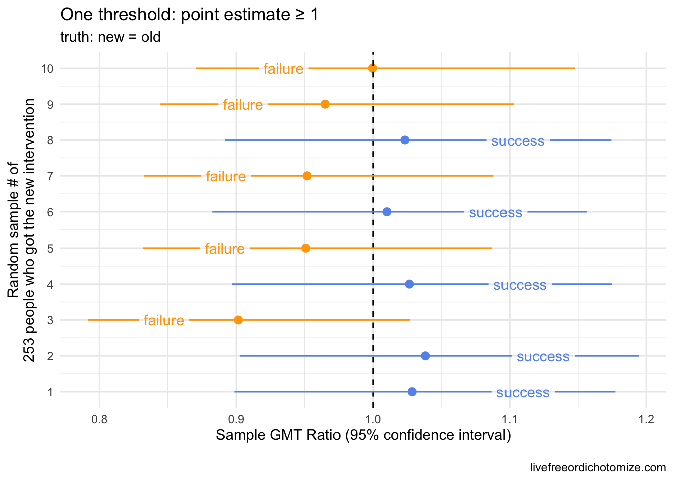 The plot above shows 10 random samples from our new intervention. Remember that these were generated exactly like our old intervention, so the truth is that they are equivalent (and thus it is also true that the new intervention is not inferior, not worse, than the old). Notice here, 50% of the samples “failed” (in orange in the plot above) by our criteria that the geometric mean (the point estimate) of our new intervention had to be greater than or equal to our observed geometric mean in the old intervention. This is exactly what we’d expect to happen! Because there is some random chance involved (we are only looking at a sample), the probability of falling on either side of a point estimate is going to be a coin toss when the “truth” is centered there.