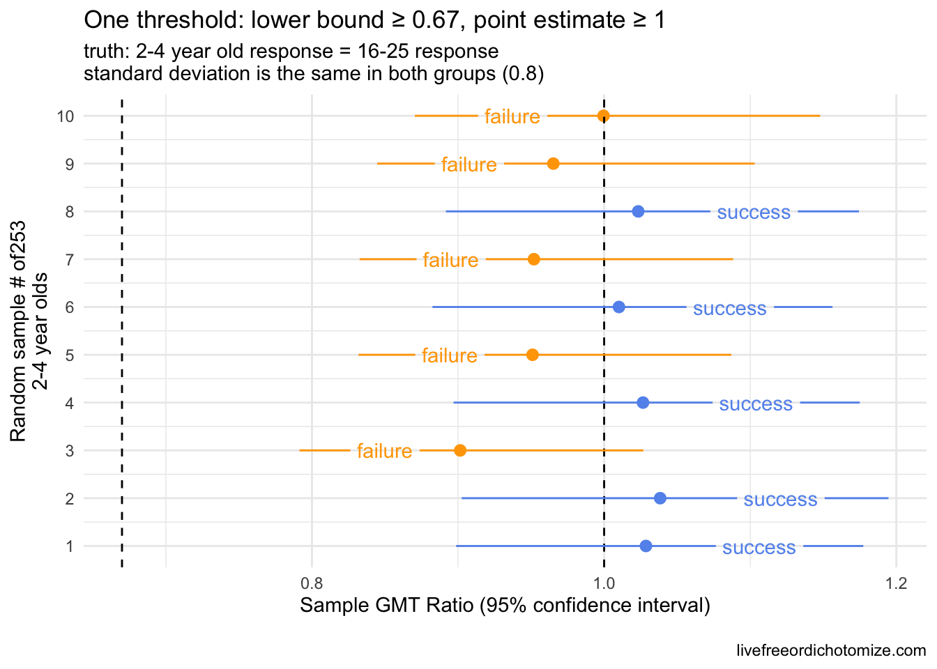 If we think that an antibody response exactly equal to that seen by 16-25 year olds is sufficient to deem this vaccine non inferior, then this is not the right threshold, as a trial testing this way will fail 50% of the time. That is, the chance of failing is a coin toss, even if the two groups are exactly equal. Below shows this again. Remember for a given trial, we are only lucky enough to see one of these outcomes in the plot below; I am showing 10 so you can see the variation based on the sampling variability.