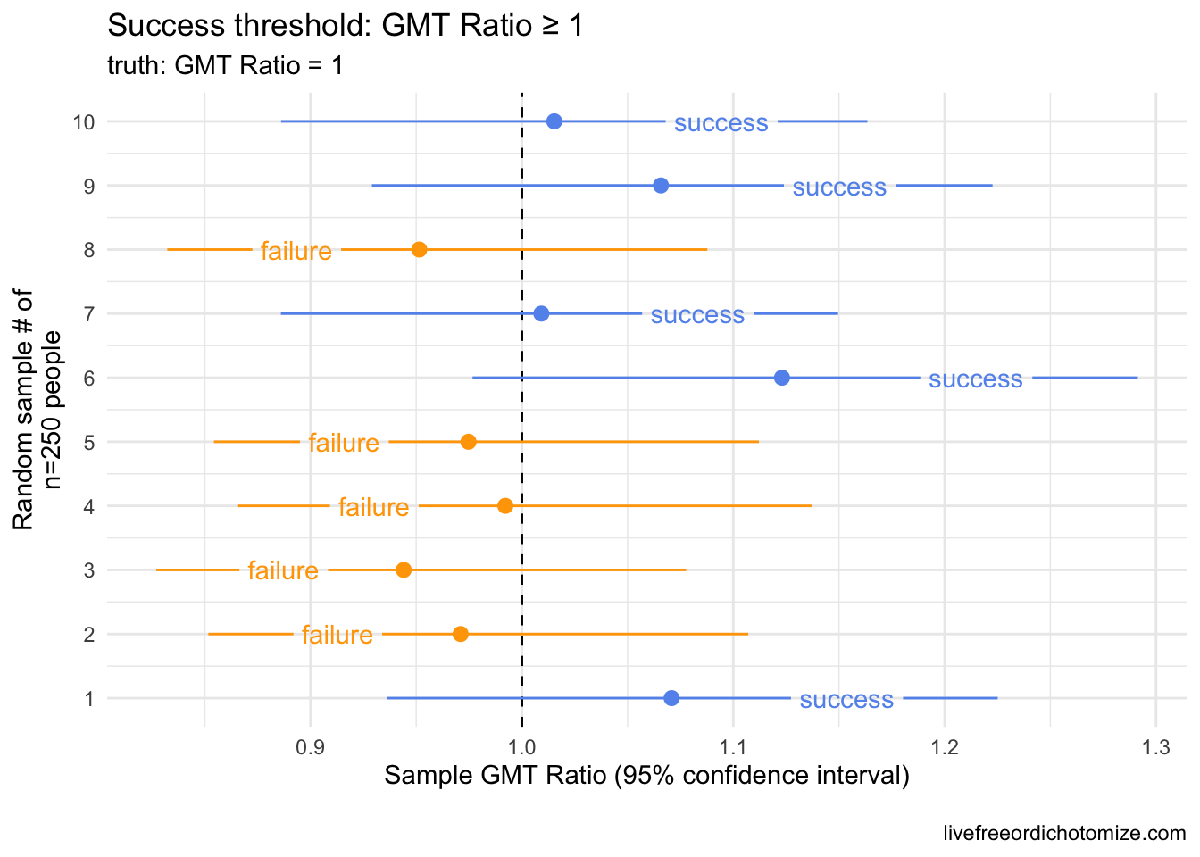 Notice in the above plot that even though the true GMT ratio between these groups should be 1 (they were drawn from the exact same distribution!), when using the point estimate as the threshold for success, we “failed” 50% of the time. It was a coin toss whether this trial succeeded or failed by this criteria.