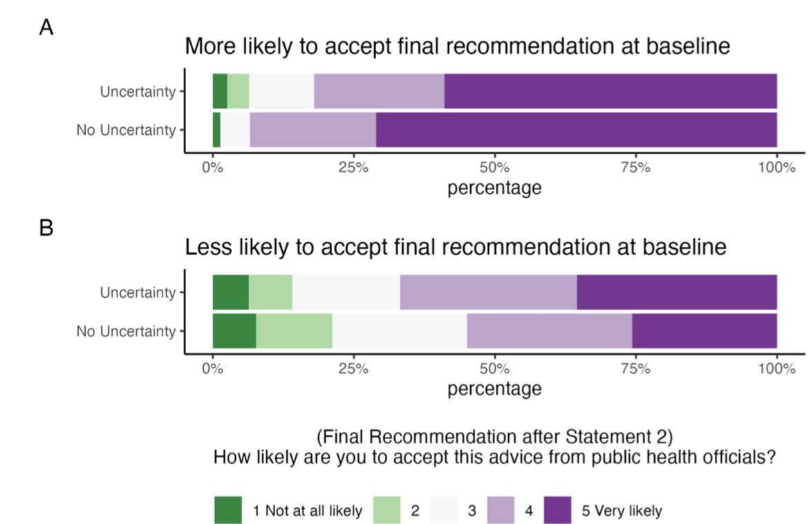 We conducted a randomized controlled trial to assess whether disclosing elements of uncertainty in an initial public health statement will change the likelihood that participants will accept new, different advice that arises as more evidence is uncovered.